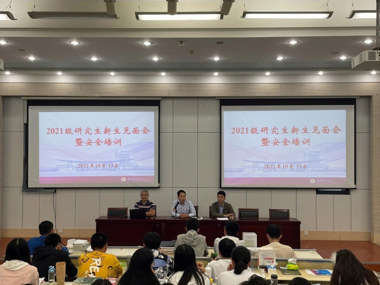 在工科楼阶梯教室举行2021级研究生新生见面会暨安全培训。院长方勇教授、副院长唐培安教授、导师代表沈新春教授、实验员夏季老师、安全员仝瑶老师和校外专家丁新龙副总经理参加会议。