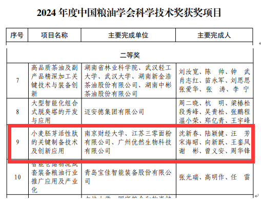 沈新春教授牵头主持的“小麦胚芽活性肽的关键制备技术及创新应用”项目获中国粮油学会科学技术奖二等奖。
