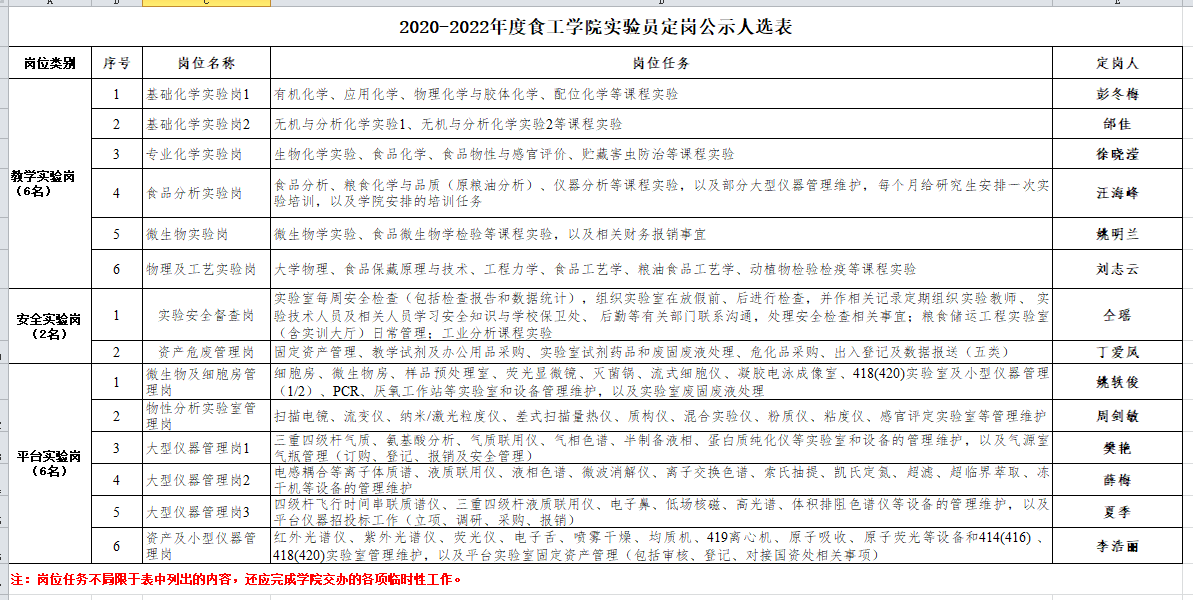 按照《禁漫天堂 实验技术人员岗位职责及选聘管理办法》文件要求,经本人自荐和学院党政联席会研究决定,2020-2022年度食工学院实验员定岗公示人选如下表。