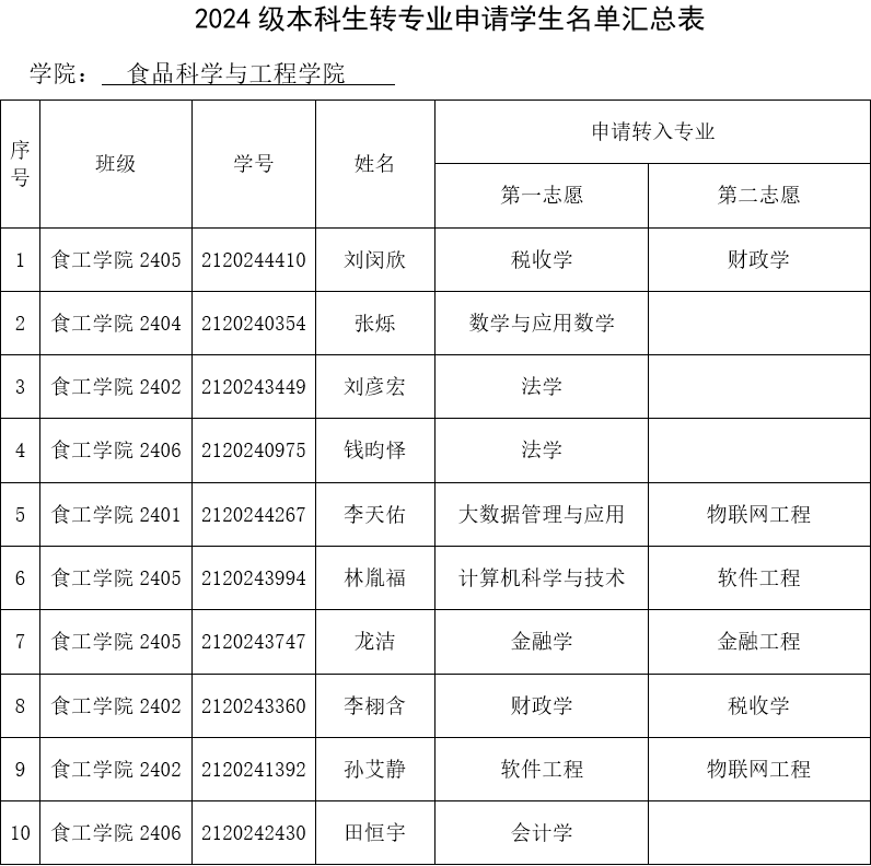根据《禁漫天堂 本科生转专业管理办法》(南财大校字〔2024〕15号)、《关于2024-2025学年第二学期本科生转专业工作安排的通知》(南财教字〔2025〕18号)要求,经学生个人申请、学院转专业领导小组审核,现将2024级本科生申请转专业学生名单予以公示。