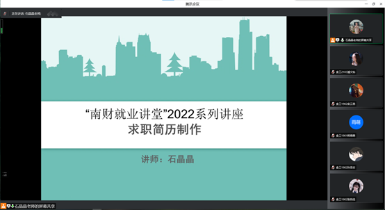 主办,校职业发展与就业协会协办的,南财就业讲堂系列讲座之 “简历制作与面试技巧”于4月28日18点至21点30分通过腾讯会议在线上顺利举办。我校150余名学生参加了此次讲座。