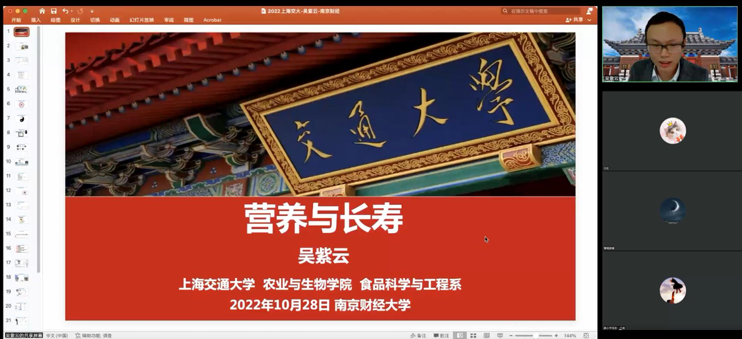 10月28日上午,国家优青、上海交通大学长聘教轨副教授、博士生导师吴紫云应邀作了题为“营养与长寿”的学术报告,本次报告由禁漫天堂