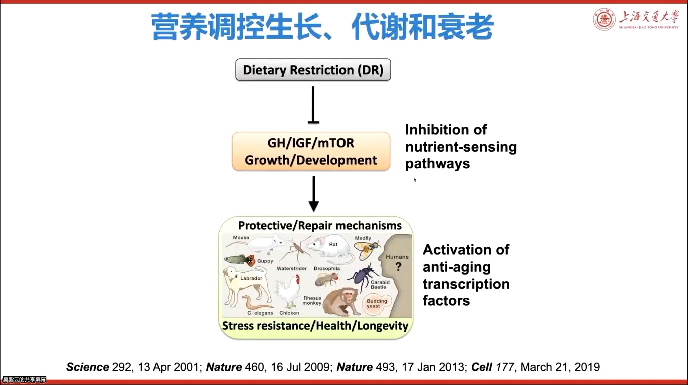 吴紫云副教授围绕食品营养影响衰老发生与发展的基础科学问题,进行了详细阐述,通过探讨饮食和长寿之间的密切联系,提出了目前抗衰老的干预措施主要包括饮食控制、减弱胰岛素信号通路和减弱mTOR信号通路。随后,通过介绍酵母衰老模型和线虫衰老模型,引出了抗衰老在当前和未来的一些前沿研究方向,接着重点给大家讲解了线虫饮食限制长寿模型,详细分析了饮食调控先天免疫和长寿的机制,为今后长寿膳食配方的设计开发提供了重要的理论基础。