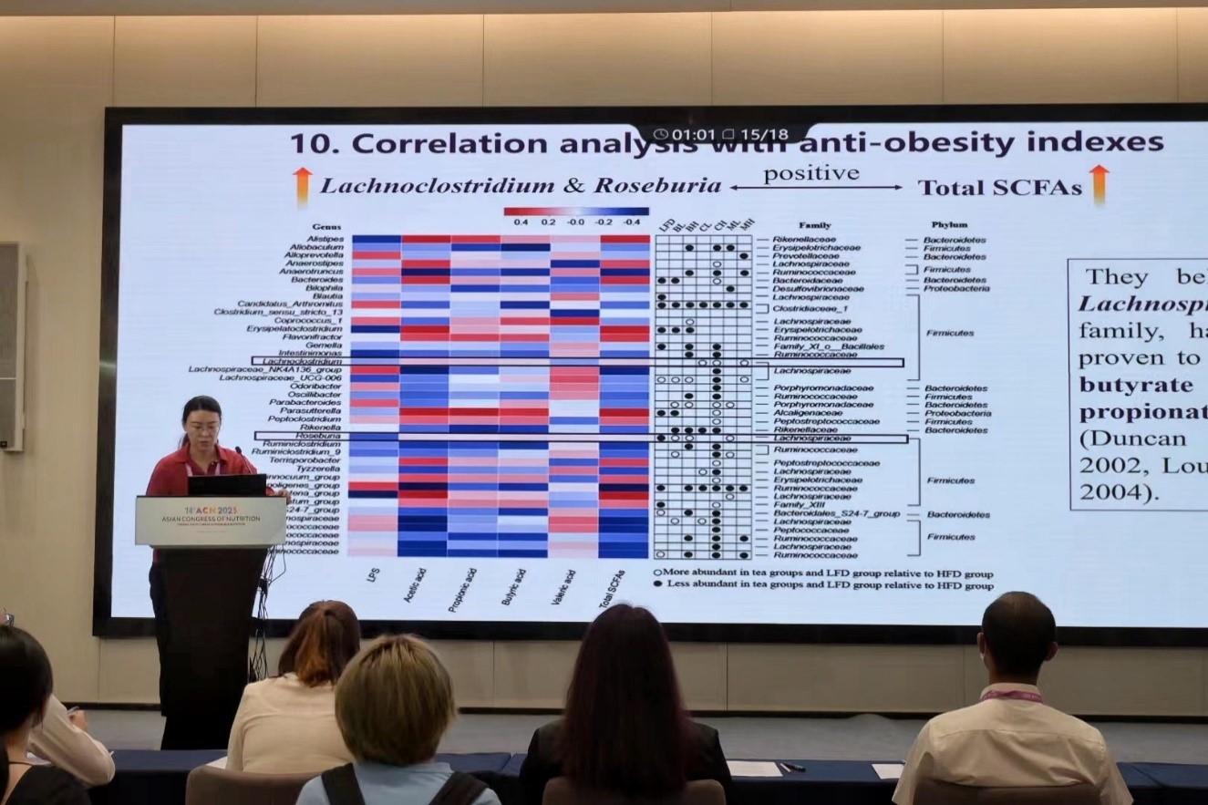 刘建辉老师受邀参会并在大会上作了题为《Mulberry anthocyanins prevent obesity by alleviating hepatic steatosis and modulating gut microbiota in mice》的大会专题报告。刘老师在报告中向大家介绍了桑葚和蔓越莓中的花青素提取物对体重和肠道菌群的影响。分析表明,桑葚和蔓越莓花青素提取物可以降低血浆脂多糖的浓度,同时降低里克氏菌的相对丰度,可通过调节肠道菌群进而影响其代谢产物如脂多糖和短链脂肪酸的含量,从而有效控制体重。