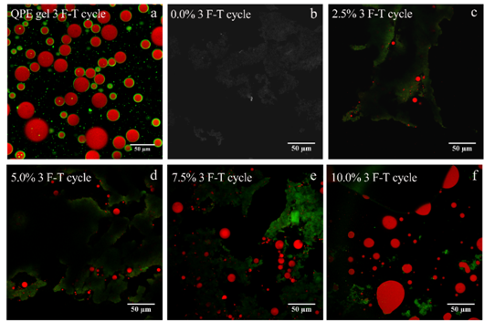 Fig. 3. CLSM images of QPE gel and MP gels after freeze–thaw cycles. ** CLSM indicates confocal laser scanning microscopy. QPE represents quinoa protein Pickering emulsion. MP represents myofibrillar protein. F-T represents freeze–thaw.