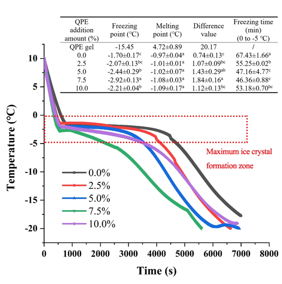 Fig. 2. Freezing curves of MP gels during freezing treatment. ** MP represents myofibrillar protein. QPE represents quinoa protein Pickering emulsion.
