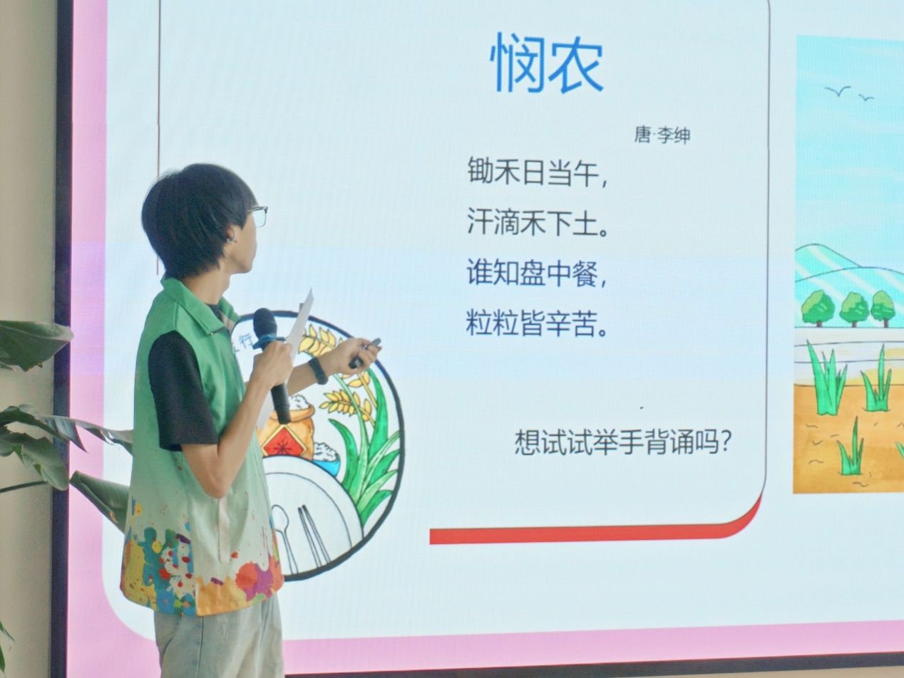 小班课堂以一首朗朗上口的儿歌《悯农》拉开序幕,“粮安薪火”宣讲团成员讲述《小米粒的红色红之旅》,借助生动的讲解,带领小班幼儿踏上“播种-插秧-收割-脱壳”的粮食生长全周期之旅,让孩子们得以直观领略粮食从田间到餐桌的奇妙旅程,深切感悟“粒粒皆辛苦”的深刻内涵。