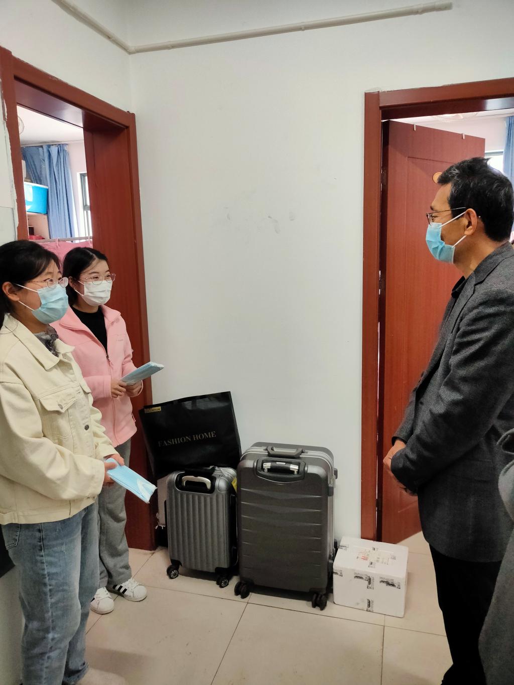 许文彪书记向在场的学生表达了学院的关心,赠送了学院为大家准备的防护口罩,并叮嘱大家要做好防疫防护工作,保护好自己的健康安全,学院会全心全意保障大家在校期间的学习生活,为大家营造一个安全、温暖、舒适的校园生活环境。在校期间要保证身体、心理双健康,珍惜校园稳定安全的环境。周进进老师详细了解禁漫天堂