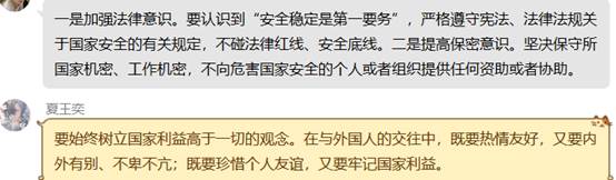 通过这次的研讨会,同学们知道了本次会议的主题“法治为青春护航,守护我们成长”,更加深入了解了自己作为社会一份子的责任,也了解了如何维护国家安全。相信大家在今后的生活里,对于那些破坏国家安全,破坏国家法治的行为有所察觉,并能运用法律手段进行国家安全的维护,共同创造一个和谐的社会,承担实现中华民族伟大复兴的重任。