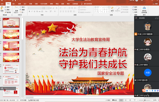 食工2001学生在线上会议中举行了“法治为青春护航,守护我们成长”为主题的研讨会。会议由食工2001班班长雍韵琪主持,由宣传委员白子仪制作;本次会议共有三项议程。