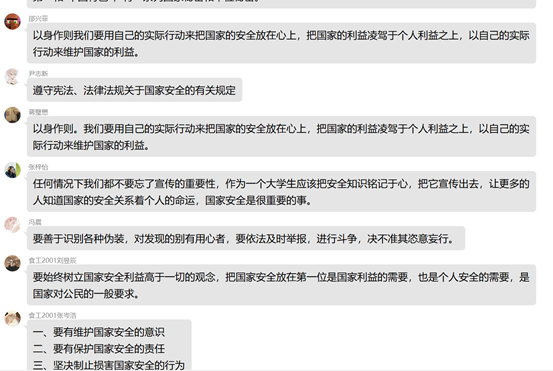 食工2001班统一组织班级学生就国家安全的防护展开讨论。在讨论会上同学们各抒己见,进行了许多相关观点的讨论与分享。