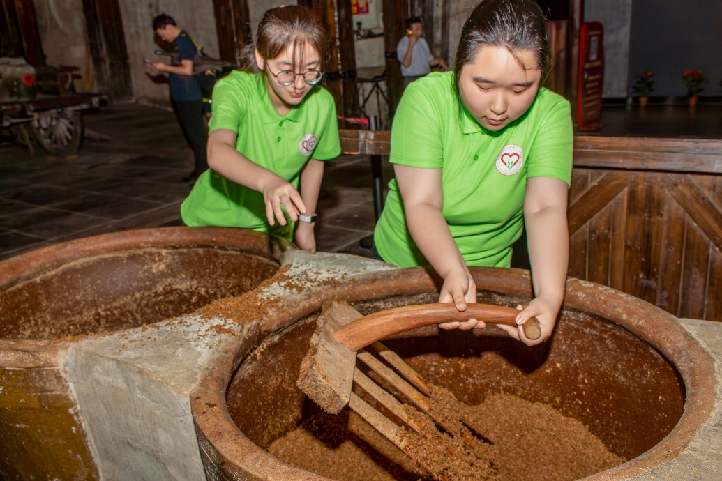 图为团队成员在体验翻醋原料的过程