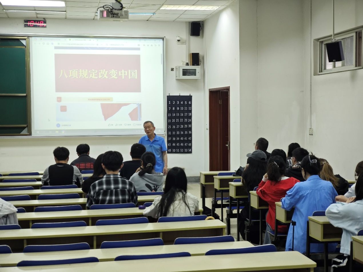 党课上,丁书俊同志强调党性是党员立身之本,对学生党员提升素养、肩负使命意义重大。他结合党的先进理论与时事热点深入讲解,帮助党员深刻理解党性修养内涵,明确加强自身建设的重要性。随后,全体党员共同观看教育警示片《八项规定改变中国》,从真实案例中感受党中央作风建设决心,强化纪律意识。