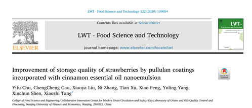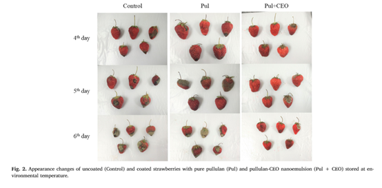 草莓果实营养丰富,拥有“水果皇后”的称号。然而,草莓成熟后表皮极薄,在采摘和储存过程中极易受到机械损伤与细菌霉菌侵染,通常情况下在常温放置3天即失水霉烂严重,失去商业价值。因此,如何维持新鲜草莓的品质,延长草莓的储藏时间一直以来都是国内外研究人员的热点问题。涂膜保鲜法因为具有操作简单易行、良好的气体选择透过性和有效防止微生物侵入等优势,成为近年来果蔬采后保鲜领域的热点研究方向。本研究以天然高分子可降解材料普鲁兰多糖为成膜基材,添加肉桂精油纳米乳液以提升复合膜的抗菌性能。对新鲜草莓涂抹保鲜的应用研究发现, 经过肉桂精油纳米乳液/普鲁兰多糖基复合膜液涂膜后的草莓,其在贮藏期结束时的重量损失、腐败率、硬度、可溶性固形物、可滴定酸和微生物指标均显著好于纯普鲁兰膜液组和对照组的草莓。实验结果表明草莓果实经过肉桂精油纳米乳液/普鲁兰多糖基复合膜液涂膜处理后,可以有效地延长贮存期,延缓衰老,并保持良好的外观品质,可见使用肉桂精油纳米乳液/普鲁兰多糖基复合膜液涂膜是一种极具潜力的保鲜手段。相关研究结果以“Improvement of storage quality of strawberries by pullulan coatings incorporated with cinnamon essential oil nanoemulsion”为题发表在LWT杂志上,禁漫天堂