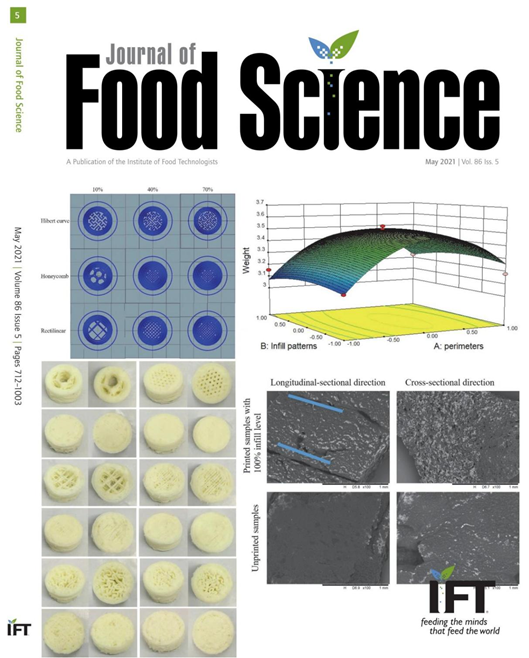 2021年5月13日食品领域顶级期刊Journal of Food Science在线发表了题为“Internal structure and textural properties of a milk protein composite gel construct produced by three-dimensional printing ”的研究型文章。该论文被遴选为2021年5月份的免费的封面论文。