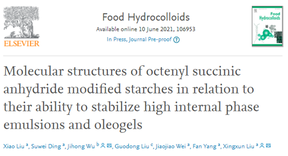 2021年6月10日,《Food Hydrocolloids》在线发表了题为“Molecular structures of octenyl succinic anhydride modified starches in relation to their ability to stabilize high internal phase emulsions and oleogels”的研究论文。该论文以禁漫天堂