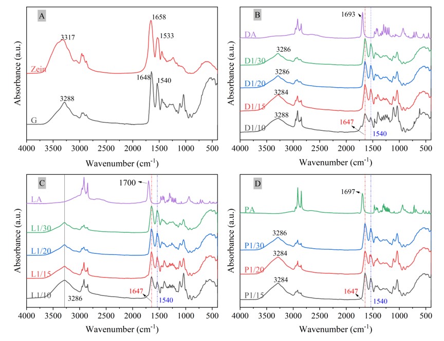 Figure 4 FTIR spectra of (A) Zein raw material and G-film, (B) DA and D-films, (C) LA and L-films, and (D) PA and P-films.