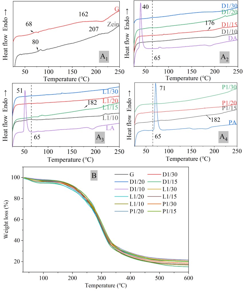 Figure 8 DSC curves of (A1) Zein raw material and G-film, (A2) DA and D-films, (A3) LA and L-films, A4) PA and P-films, and (B) TG ofG-, D-, L-, and P-films.