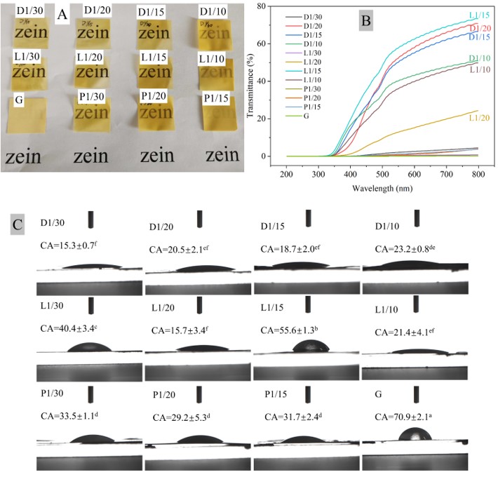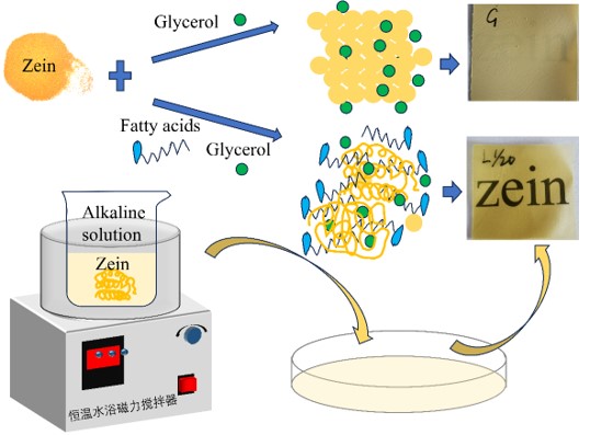 由于在碱性溶剂中的脱酰胺反应,玉米醇溶蛋白的结晶度在成膜后降低。SEM、XRD和FTIR分析结果表明,脂肪酸和玉米醇溶蛋白之间的相互作用降低了蛋白质分子的有序度,增加了玉米醇溶蛋白与甘油和碱性溶剂的相容性。这有助于减少玉米醇溶蛋白在成膜过程中的聚集,从而使薄膜具有致密的微观结构。研究发现,添加比例为玉米醇溶蛋白重量1/15的癸酸或月桂酸,可以获得具备良好紫外线阻隔和可见光透射率,以及相对优异的机械和水蒸气阻隔性能的薄膜。这些信息将有助于减少使用有机溶剂开发玉米醇溶蛋白基的食品包装薄膜。