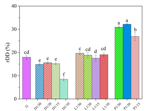Figure 2 Relative deamidation degree of zein in films. D. L and P represent decanoic acid, lauric acid, and palmitic acid, respectively; and the number after the letter represents the ratio of fatty acids to zein. The content of glycerol in all membranes is 25% of zein, and G represents only glycerol.