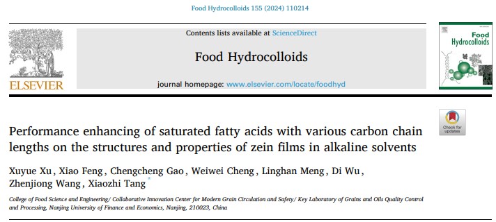 汤晓智教授课题组在期刊Food Hydrocolloids(Q1,IF: 11)发表题为“Performance enhancing of saturated fatty acids with various carbon chain lengths on the structures and properties of zein films in alkaline solvents”的研究性论文。