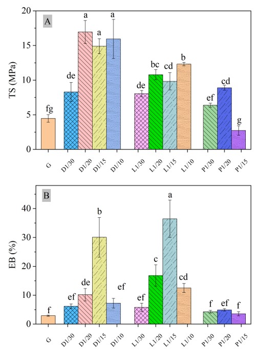 Figure 7 Tensile strength (A) and elongation at break (B) of G-, D-, L- and P-films.
