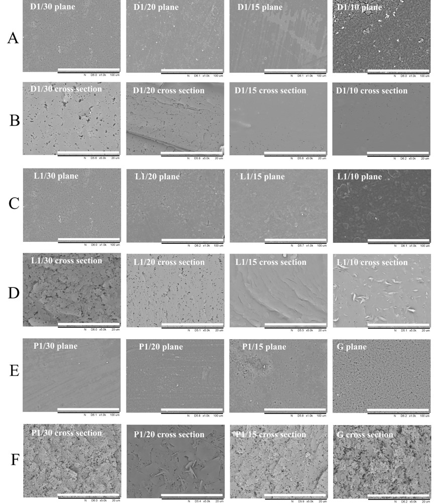 Figure 3 SEM images of planes (A, C, and E, × 1000, scale bar = 100 μm) and cross-sections (B, D, and F, × 5000, scale bar = 20 μm) of D-, L-, P-, and G-films.