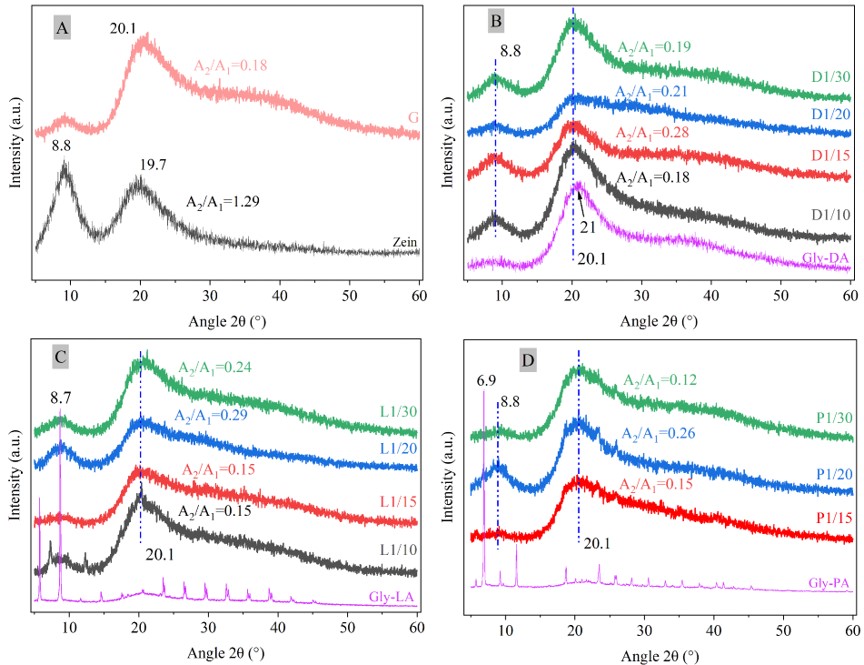 Figure 5 XRD patterns of (A) Zein raw material and G-film, (B) D-films, (C) L-films, and (D) P-films. Gly-DA, Gly-LA, and Gly-PA were dry mixtures that were consistent with the film-forming formulations of D1/15, L1/15, and P1/15, but do not contain zein. The A2/A1 was area ratios of 2θ = 8.8° (A2) and 2θ = 19.7–20.1° (A1).