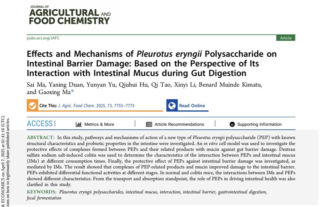 2021级硕士研究生马赛(第一作者),马高兴教授(通讯作者)在国际TOP期刊Journal of Agricultural and Food Chemistry (Q1,IF: 5.7)发表题为“Effects and Mechanisms of Pleurotus eryngii Polysaccharide on Intestinal Barrier Damage: Based on the Perspective of Its Interaction with Intestinal Mucus during Gut Digestion”的研究性论文。